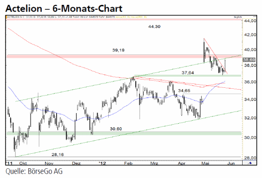 Ausblick: Die Aktien von Actelion könnten die Korrekturphase seit dem Kurssprung Ende April bereits am vergangenen Freitag beendet haben. Eine Fortsetzung der steilen Aufwärtsbewegung wird damit nach unserer Auffassung immer wahrscheinlicher. Die Long-Szenarien: Kann der Wert auch über die Kursbarriere bei 39,19 CHF ausbrechen, dürfte sich die laufende Kaufwelle zunächst bis 41,55 CHF fortsetzen. Entsprechend könnte man einen nachhaltigen Anstieg über 39,19 CHF „long“ handeln. Wird in der Folge auch die 41,55 CHF-Marke überwunden, wäre ein Kaufimpuls bis 44,30 CHF möglich. Auf mittlere Sicht könnten die Aktien in diesem Fall sogar weiter bis 47,50 CHF haussieren. Die Short-Szenarien: Erst ein deutlicher Rückfall unter 37,64 CHF könnte die Ambitionen der Käufer etwas einbremsen und zu einer Ausweitung der Korrektur bis 34,65 CHF führen. Von dort aus würde sich der Aufwärtstrend nach unserer Einschätzung jedoch weiter fortsetzen können. Erst ein Bruch dieser Marke würde zu einem Rückfall in den früheren Seitwärtsmarkt und Abgaben bis 31,90 CHF und darunter auf 30,60 CHF führen.