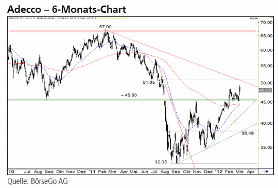 Ausblick: Der erste Schritt zur Erholungsfortsetzung wurde mit Überwindung der Marke von 45,50 CHF vollzogen. Jetzt bedarf es einzig einem Anstieg über 51,05 CHF und die Käufer sollten die nächste Aufwärtsbewegung einleiten. Die Long-Szenarien: Unter kurzfristigen Gesichtspunkten könnte sich eine leichte Kursschwäche als Einstiegsgelegenheit für eine „long“ Spekulation in Richtung 51,05 CHF auszahlen. Ziehen die Aktien über diesen Widerstand hinaus, wäre mitsamt Ausbruch über den seit 67,00 CHF ausgebildeten Abwärtstrend eine weitere Aufwertung bis 57,05 und darüber bis rund 62,30 CHF einzuplanen. Die Short-Szenarien: Verbleibt die Aktie jedoch unterhalb von 51,05 CHF, sollte sich mitsamt zunehmendem Verkaufsdruck und Unterschreitung des Niveaus von 45,50 CHF eine Abwärtsbewegung bis rund 40,00 CHF ergeben können. Sollten die Aktien im weiteren Verlauf auch noch unter die Unterstützung bei 38,49 CHF zurückfallen, müssten weitere Verluste bis 32,05 CHF berücksichtigt werden.