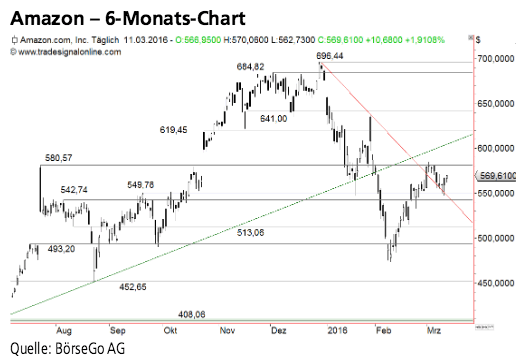 Die Erholung bei den Aktien von Amazon könnte in Kürze in eine neue Runde gehen. Allerdings stellen sich dem Wert einige starke Widerstände in den Weg. Die Long-Szenarien: Solange der Wert nicht unter die 542,74 USD-Marke einbricht, ist die laufende Aufwärtsbewegung intakt und könnte sich in dieser Woche bis an den markanten Widerstand bei 580,57 USD fortsetzen. Dort fällt eine Richtungsentscheidung. Bricht der Wert auch über diese Hürde aus, käme es zu einem Aufwärtsimpuls, der direkt an die gebrochene Aufwärtstrendlinie auf Höhe von 609,00 bzw. 619,45 USD führen kann. Auf diesem Niveau sollte man sich auf eine weitere Zwischenkorrektur gefasst machen. Wird die Hürde dagegen im weiteren Verlauf ebenfalls überwunden, könnte der Kaufimpuls weiter bis 641,00 USD und schliesslich bis 660,00 USD führen. Die Short-Szenarien: Bei einem Unterschreiten der Unterstützung bei 542,74 USD dürfte sich die Korrekturphase weiter ausdehnen. In diesem Fall wäre ein Rücksetzer entlang der überschrittenen Abwärtstrendlinie wahrscheinlich. Ausgehend von der Haltemarke bei 513,06 USD könnte sich der Aufwärtstrend jedoch wieder in Richtung der 580,57 USD in Bewegung setzen.