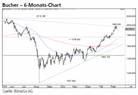 Ausblick: Die abgelaufene Handelswoche endete negativ für die Aktien und könnte ein Vorgeschmack auf das sein, was in den kommenden Tagen beziehungsweise Wochen folgen könnte. Die Short-Szenarien: Nach Wochen steter Kurssteigerungen scheinen aktuell Gewinnmitnahmen einzusetzen. Diese könnten nach unserer Auffassung durch Short-Engagements genutzt werden, um an einer sich anbahnenden Korrekturbewegung zu partizipieren. In einer ersten Abwärtsphase könnte das Niveau von rund 176,00 CHF erreichbar sein, bevor darunter mit weiteren Rücksetzern bis 144,70 CHF gerechnet werden müsste. Wird auch diese Unterstützung gebrochen, würde das Tief vom Juli 2010 bei 107,80 CHF als nächstes Korrekturziel in Frage kommen. Die Long-Szenarien: Alternativ stabilisieren sich die Aktien bei 176,00 CHF und überwinden anschliessend die primäre Abwärtstrendlinie auf Höhe von 200,00 CHF. Darüber ist ein Aufwärtsschub bis 215,30 und mittelfristig bis 250,00 CHF denkbar.