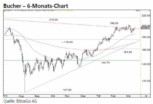 Ausblick: Auf dem aktuellen Niveau sind die Aktien von Bucher zwar weiterhin deutlich überkauft und somit korrekturanfällig. Ohne klare Signale auf der Shortseite bleibt der Wert nach unserer Auffassung jedoch ein Kauf. Die Long-Szenarien: Sollten die Bullen die kurzfristige Unterstützung bei 186,50 CHF verteidigen können, dürfte zunächst das Zwischenhoch bei 202,50 CHF erneut angesteuert werden. An dieser Stelle würde mit einem Ausbruch über die Marke eine mittelfristige Weichenstellung vollzogen. Denn im Anschluss dürften die Aktien zügig bis 215,30 CHF und darüber auf mittlere Sicht bereits bis 240,00 CHF haussieren. Entsprechend könnte man einen Anstieg über 202,50 CHF „long“ handeln. Die Short- Szenarien: Wird dagegen die Unterstützung bei 186,50 CHF aufgegeben, wäre dies ein klares Indiz für eine Ausweitung der Korrektur des Aufwärtstrends. In diesem Fall wäre mit Abgaben bis zur markanten Unterstützung bei 176,00 CHF zu rechnen, ehe sich die Aktien an dieser Stelle stabilisieren und erneut ansteigen könnten. Ein nachhaltiges Shortsignal würde erst durch einen dynamischen Bruch der 176,00 CHF-Marke ausgelöst und dürfte Verluste bis 144,70 CHF nach sich ziehen.
