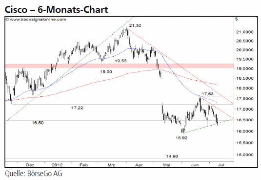 Ausblick: Unterhalb von 17,63 USD sind die Aktien von Cisco weiter fest in der Hand der Verkäufer. Der Kurseinbruch im Mai dürfte sich weiter auswirken. Die Short-Szenarien: Fallen die Aktien von Cisco deutlich unter 16,50 USD zurück, könnte nurmehr das Zwischentief bei 15,92 USD einen erneuten Ausverkauf abbremsen. Sollte diese Marke durchbrochen werden, wäre mit weiteren Verlusten bis 14,90 USD zu rechnen. Entsprechend könnte man diesen Rückfall aus dem symmetrischen Dreieck mit einem Shortengagement handeln. Würde auch die 14,90 USD-Marke unterschritten, könnte sich der Abwärtstrend bereits bis zum Tief des Jahres 2011 bei 13,30 USD ausweiten. Die Long-Szenarien: Ein erstes tendenziell positives Signal würde bei einem Anstieg über 17,22 USD generiert. Doch erst ein nachhaltiger Ausbruch über den Widerstand bei 17,63 USD könnte eine stärkere Aufwärtsbewegung nach sich ziehen. Sie dürfte den Wert bis 18,50 USD führen. An dieser Stelle könnte sich der Abwärtstrend jedoch weiter fortsetzen. Sollte die Hürde jedoch durchbrochen werden, würden bei 19,00 und 19,55 USD bereits weitere Barrieren warten, die einen erneuten Rückfall bis weit unter die 18,50 USD-Marke auslösen könnten.