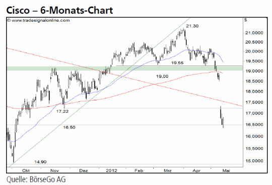 Ausblick: Nach unserer Einschätzung ist der Wert aktuell derart massiv angeschlagen, dass nurmehr die Verteidigung der 16,50 USD-Marke einen weiteren Ausverkauf bis 13,30 USD verhindern könnte. Die Short-Szenarien: Durchbricht der Wert auch die Unterstützung bei 16,50 USD, wäre ein weiteres Verkaufssignal aktiv. In der Folge dürften die Aktien zunächst bis 15,50 USD und darunter bis auf 14,90 USD zurückfallen. Nach einer moderaten Erholung könnte sich der neu etablierte Abwärtstrend auf mittlere Sicht bis 13,30 USD fortsetzen, ehe es an dieser Stelle zu einer Stabilisierung kommen könnte. Die Long-Szenarien: Sollte es den Käufern dagegen gelingen, die Marke bei 16,50 USD zu verteidigen, dürfte ein korrektiver Anstieg bis 17,22 USD erfolgen. Eine tragfähige Erholung wäre jedoch erst oberhalb dieser Barriere möglich. Im Anschluss an einen solchen Anstieg könnten die Aktien von Cisco Teile des Abwärtsgaps schliessen und bis 18,30 USD, gegebenenfalls auch bereits bis 19,00 USD ansteigen. An dieser Hürde könnte sich der Abwärtstrend nach unserer Einschätzung jedoch weiter fortsetzen.