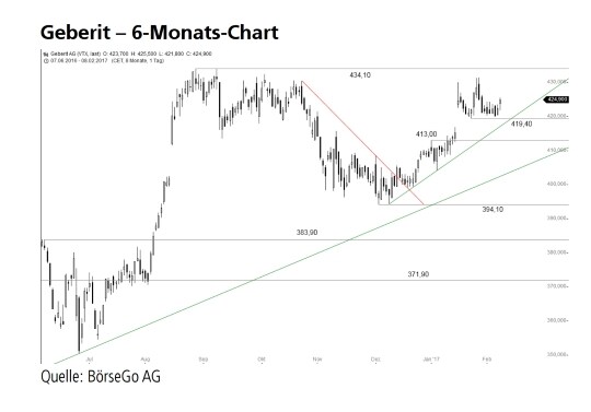 Rückblick: Im August des Vorjahres erreichten die Aktien von Geberit ein neues Allzeithoch bei 434,10 CHF, ehe den Bullen dort etwas die Kräfte schwanden und der Wert in der Folge in eine Korrektur überging.