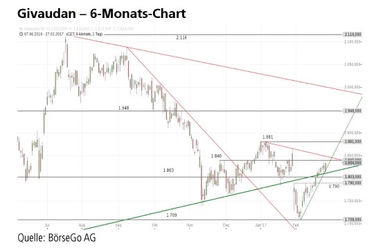 Rückblick: Die Aktien von Givaudan begaben sich nach einem Hoch bei 2.116 CHF ab Juli 2016 in eine Korrektur, sodass sich der Ausbruch über die 1.948 CHF-Marke als Bullenfalle darstellte.