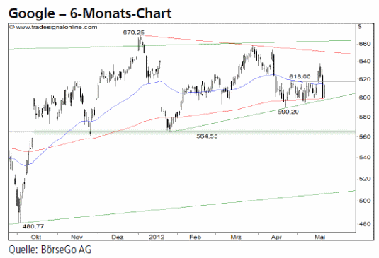 Ausblick: Kurzfristig steht der Wert damit an einer Unterstützungsmarke, deren Bruch für eine Fortsetzung der Korrektur sprechen würde. Der mittelfristig bullishe Ausblick für die Aktien sollte nach unserer Einschätzung davon jedoch unberührt bleiben. Die Long-Szenarien: Fallen die Aktien unter 590,20 USD zurück, dürfte sich die laufende Korrektur bis 564,55 USD fortsetzen. Hier könnte die Aktie jedoch wieder nach oben drehen und bei einem Anstieg über 618,00 USD direkt bis 653,00 USD haussieren. Würde auch diese Marke durchbrochen, sind Folgekäufe bis zum Jahreshoch bei 670,25 USD zu erwarten. Darüber wäre ein mittelfristiges Kaufsignal mit einem Ziel bei 747,24 USD aktiv. Die Short-Szenarien: Sollten die Aktien von Google hingegen wider Erwarten nachhaltig unter 564,55 USD zurückfallen, wäre die gesamte Aufwärtsbewegung seit Oktober in Frage zu stellen. In diesem Fall sind weitere Verluste bis 530,00 USD und auf mittlere Sicht bereits bis 480,77 USD zu erwarten.