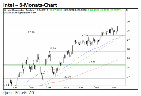Ausblick: Mit dem erst gestern markierten Mehrjahreshoch bei 28,52 USD überzeugen die Intel Aktien weiterhin mit vorherrschendem Aufwärtsdruck. Von Müdigkeit ist keine Spur und somit erscheinen nach unserer Ansicht weitere Kursavancen möglich, welche man „long“ handeln könnte. Die Long- Szenarien: Sofern die Aktien nochmals das Ausbruchsniveau im Bereich von 27,50 bis 28,00 USD testen sollten, wäre dies eine ideale Einstiegsmöglichkeit, um an weiteren Zugewinnen partizipieren zu können. Mit oder ohne Rücklauf besitzen die Intel Aktien das Potenzial, weiter bis 29,50 USD anzusteigen. Ein Ausbruch über dieses im Juli 2005 erreichte Hoch generiert mittelfristig weitere Gewinne bis in den Bereich um 34,00 USD. Die Short-Szenarien: Brechen die Aktien wider Erwarten die laufende Ausbruchsbewegung mit Kursen unterhalb von 27,40 USD ab, müssten weiter fallende Kursnotierungen bis zur Unterstützung bei 25,78 USD berücksichtigt werden. Überdies sind im Zuge des damit einhergehenden Trendlinienbruchs der Aufwärtsbewegung seit September 2009 zusätzliche Rückschläge bis 24,36 USD keinesfalls ausgeschlossen. Unterhalb davon könnte es brenzlig für die Bullen werden.