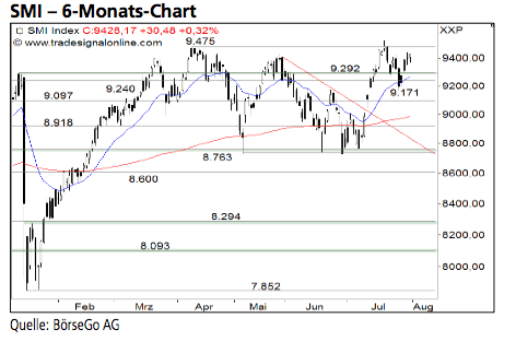 Die dreiteilige Abwärtsbewegung seit dem Hoch bei 9.525 Punkten mitsamt des schnellen Konters in den vergangenen Tagen lässt sich bullish interpretieren. Neue Verlaufshochs im Index sind daher wahrscheinlich. Die Long-Szenarien: Der Index könnte bereits am Montag versuchen, den Widerstand bei 9.475 Punkten zu überwinden. Das bisherige Jahreshoch notiert bei 9.525 Punkten. Spätestens wenn dieses überschritten wird, hätten die Käufer im Index ein aussagekräftiges mittel- bis langfristiges Kaufsignal generiert. In einem ersten Schritt dürfte der SMI das Allzeithoch aus dem Jahr 2007 bei 9.548 Punkten ansteuern. Dort besitzen die Verkäufer die letzte Gelegenheit, eine Gegenbewegung einzuleiten. Können sie aber auch an dieser Marke nichts ausrichten, wäre der Weg auf 9.700 Punkte frei. Die Short-Szenarien: Scheitert der SMI Index im ersten Anlauf am Hoch bei 9.475 Punkten, könnte es zu einem nochmaligen Test der Unterstützung bei 9.292 Punkten kommen. Dort könnten die Käufer den Index erneut auffangen. Bleibt eine Gegenbewegung aus, wird auch ein Test des Vorwochentiefs bei 9.171 Punkten möglich. Erst darunter würde sich das Chartbild verschlechtern.