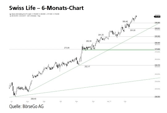 Rückblick: Mit dem Ausbruch über das Hoch des Jahres 2015 bei 273,86 CHF im November 2016, bildeten die Aktien von Swiss Life ein mittelfristiges Kaufsignal aus und setzten die im Juli 2016 begonnene Rally fort.