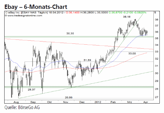 Ausblick: Oberhalb von 35,35 USD haben die Bullen die Aktien von Ebay aus unserer Sicht weiter fest im Griff. Ein Ende der laufenden Korrektur könnte daher eine direkte Fortsetzung des Aufwärtstrends auslösen. Die Long-Szenarien: Kann sich der Wert entsprechend über 35,35 USD behaupten, wäre mit einem direkten Wiederanstieg bis 37,00 und 38,18 USD zu rechnen. Sollte auch das Jahreshoch überwunden werden können, würde dies nach unserer Auffassung ein weiteres Kaufsignal zur Folge haben. Dies könnte man entsprechend „long“ handeln. Denn oberhalb von 38,18 USD läge der nächste Widerstand erst bei 40,72 USD, dem Hoch aus dem Jahr 2007. Kann auch diese Marke überschritten werden, sind langfristig sogar Kurssteigerungen bis 46,00 USD möglich. Die Short-Szenarien: Ein Rücksetzer unter 35,35 USD würde dagegen kurzfristig zu einer Fortsetzung der Korrektur bis 34,00 USD und darunter gegebenenfalls bis 33,00 USD führen. Diese Korrektur würde den übergeordneten Aufwärtstrend jedoch nicht in Frage stellen. Vielmehr könnte von dort aus bereits wieder ein mittelfristiger Anstieg einsetzen. Erst ein signifikanter Ausverkauf unter 33,00 USD würde das generell bullishe Chartbild eintrüben. In diesem Fall wären Verkäufe bis 31,59 und letztlich 28,37 USD zu erwarten.