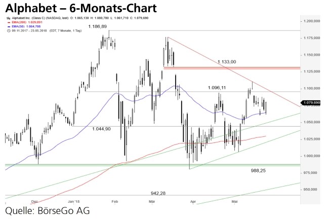 Rückblick: Nach dem Ausbruch über das damalige Rekordhoch bei 988,25 USD ging der Aufwärtstrend der Aktien der Google-Mutter Alphabet in eine neue Runde und führte den Wert bis zum Januar dieses Jahres auf ein neues Allzeithoch bei 1.186,89 USD.