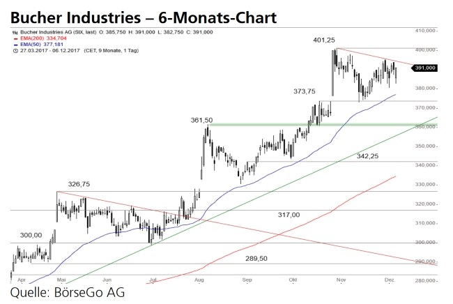 Rückblick: Im April dieses Jahres brachen die Aktien von Bucher Industries kurzzeitig über ihr damaliges Allzeithoch bei 326,75 CHF aus, ehe es zu einer Korrektur des im November 2016 bei 215,80 CHF begonnenen Aufwärtstrends kam.