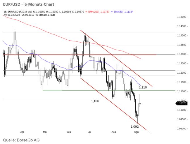 Rückblick:Das Währungspaar EUR/USD befindet sich seit Juni in einem fallenden Trendkanal. Die untere Begrenzung dieses fallenden Trendkanals wurde am 03.09.2019 mit dem Verlaufstief bei 1,092 USD erneut bestätigt.
