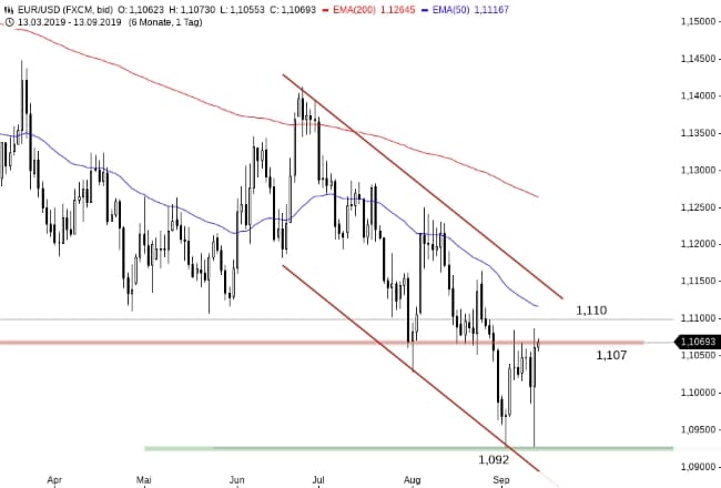 Ausblick: Das Währungspaar EUR/USD zeigt sich seit Wochen schwach und ist in den Vortagen unter die wichtige Marke von 1,10 USD gerutscht. Damit wurde die bisherigeSchwäche weiter unterstrichen. Kurzfristige Aufwärtskorrekturen sollten nicht über die übergeordnete Schwäche hinwegtäuschen. Die Short-Szenarien: Das Währungspaar bleibt schwach und rutscht nachhaltig unter die wichtige Marke von 1,10 USD. In derFolge dürfte dann die grosse Unterstützung bei 1,08 USD angelaufen werden. Darunter würde als nächste Unterstützung der Bereich um 1,0560 USD bis 1,0500 USD folgen. Die Long-Szenarien: Das Währungspaar kann den Doppelboden im Bereich von 1,092 USD nutzen und sich im Verlauf über der Marke von 1,10 USD halten. Dann wäre ein Anstieg bis zum Widerstand bei 1,107 USD zu erwarten. Darüber dürfte das Währungspaar bis in den Bereich von 1,1100 USD ansteigen. Spätestens dann dürfte es aber wohl wieder bergab gehen. Eine Änderung der bearishen Gesamtlage würde sich erst über 1,1300 USD ergeben.