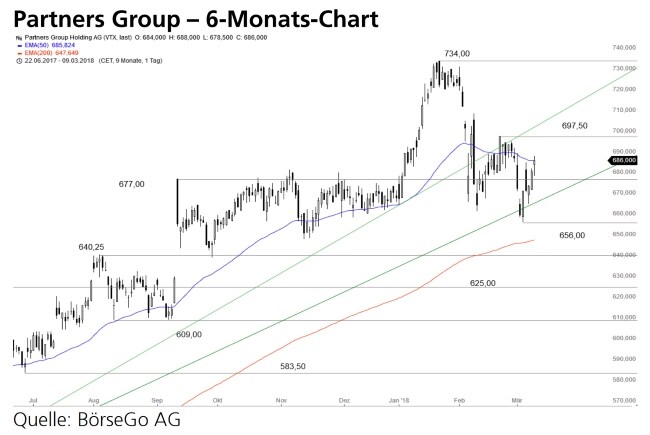 Rückblick: Der beeindruckende Aufwärtstrend der Aktien von Partners Group führte in den vergangenen Monaten über die Widerstände bei 640,25 und 677,00 CHF.