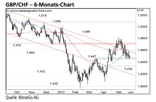 Der Ausbruch über 1,472 CHF Mitte Mai hat die Ambitionen der Bullen bereits eindrucksvoll aufgezeigt. Für die Käuferseite gilt es jetzt, die 1,447 CHF zu verteidigen, um von dort aus den mittelfristigen Aufwärtstrend fortzusetzen. Die Long-Szenarien: Bricht GBP/CHF über die kleine Hürde bei 1,459 CHF aus, dürfte es zu einem weiteren Angriff auf die 1,472 CHF-Marke kommen. Ein Ausbruch über diese Hürde würde eine Kaufwelle bis 1,496 CHF nach sich ziehen, ehe dort mit einer Korrektur zu rechnen wäre. Auf mittlere Sicht könnte der Wert oberhalb von 1,496 CHF sogar bis 1,518 CHF ansteigen. Die Short-Szenarien: Sollte GBP/CHF dagegen unter die Ausbruchsmarke bei 1,447 CHF zurückfallen, könnte es ausgehend von der Unterstützung bei 1,433 CHF zwar zu einem weiteren Ausbruchsversuch über 1,472 CHF kommen, das Aufwärtspotential einer solchen Bewegung wäre aus unserer Sicht jedoch begrenzt. Ein Ausverkauf unter 1,433 CHF würde den Anstieg der letzten Wochen dagegen neutralisieren und zu einem mittelfristigen Rückfall bis zur 1,422 CHF- Marke und darunter bereits bis 1,402 CHF führen. Kann diese Unterstützung nicht zu einer Bodenbildung genutzt werden, wären weitere Verluste bis 1,390 CHF zu erwarten.