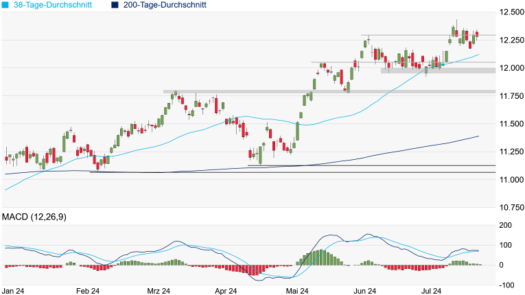 12.570 Punkten. Das Rekordhoch vom Januar 2022 bei 12.997 Punkten wäre danach auch nicht mehr allzu weit entfernt. Doch es besteht auch die Gefahr enttäuschend aufgenommener Bilanzen. Fällt der SMI unter sein Verlaufstief vom vergangenen Freitag bei 12.165 Punkten, könnte ein Test der aktuell bei 12.121 Punkten verlaufenden 38-Tage-Linie drohen.