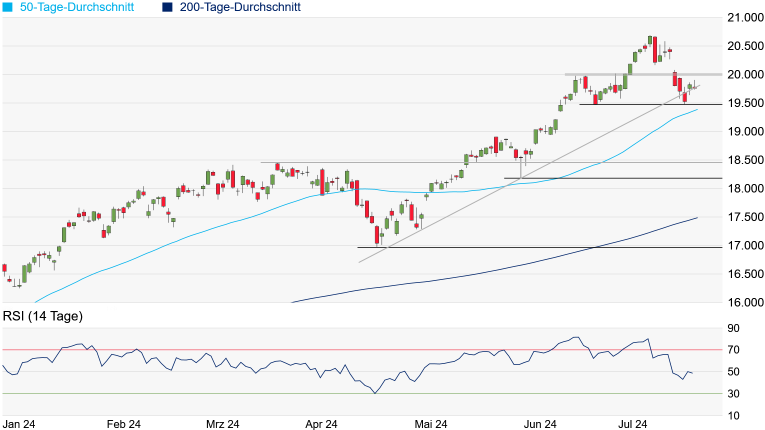 Früh knapp 170 Punkte im Minus. Möglicherweise steuert der NASDAQ-100 noch einmal den Unterstützungsbereich bei 19.479/19.473 Punkten an. Bei einem Unterschreiten könnte zusätzliches Verkaufsinteresse aufkommen. Allerdings würde mit der aktuell bei 19.389 Punkten verlaufenden 50-Tage-Linie bereits die nächste signifikante Unterstützung auftauchen. Kann der NASDAQ-100 hingegen seinen Aufwärtstrend doch noch überqueren, würde aber wohl erst das Überqueren der psychologisch wichtigen