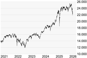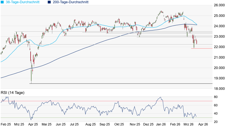 gebessert. Doch möglicherweise droht dennoch ein Unterschreiten der Februar-Marke, womit erneut Gefahr in Verzug wäre. Bis zum Korrekturtief vom April 2025 bei 18.490 Punkten würde sich dann nur noch das jüngste Verlaufstief bei 21.864 Punkten in den Weg stellen. Erschwerend kommt hinzu, dass der kurzfristigere 38-Tage-Durchschnitt den langfristigen 200-Tage-Durchschnitt wohl in Kürze von oben nach unten kreuzt, was in der Charttechnik eher negativ gewertet und häufig als Trendwendepunkt