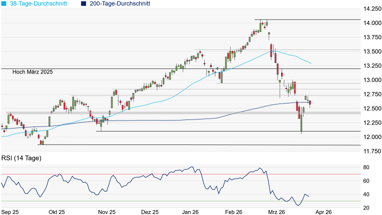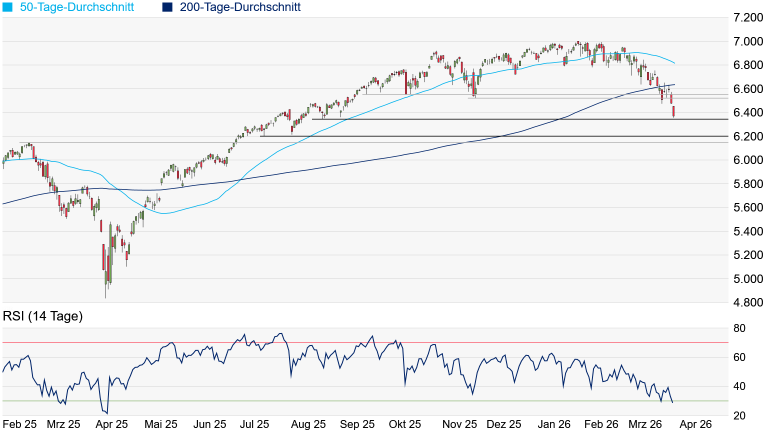 bei 6.213 Punkten noch auf leichte Unterstützungen, doch taucht die nächste signifikante Unterstützung nun erst am Hoch vom Februar 2025 bei 6.147 Punkten auf. Es liegt jedoch bereits eine leicht überverkaufte Marktphase vor, was Hoffnungen auf eine baldige Gegenbewegung machen könnte. Die charttechnische Situation würde sich jedoch erst mit der Rückeroberung der 200-Tage-Linie erheblich entspannen.
