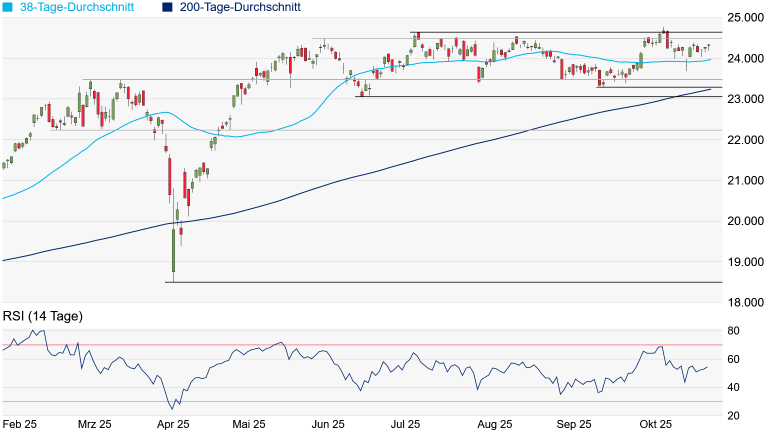 die runde Marke von 25.000 Punkten schnell in den Fokus rücken. Auf der Unterseite hat sich der DAX zuletzt jedoch etwas von der aktuell bei 23.972 Punkten verlaufenden 38-Tage-Linie nach oben abgesetzt. Geht es jedoch wieder darunter, könnte das Doppeltop vom März bei 23.476 Punkten noch einmal ein Thema werden.