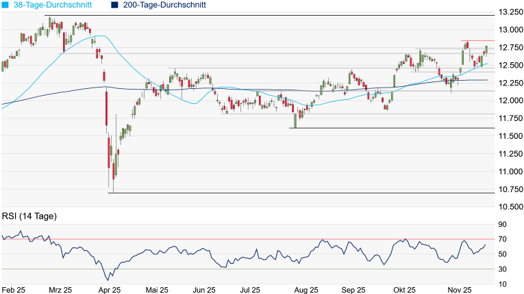 Quelle: Bloomberg. Bitte beachten Sie, dass aus der Wertentwicklung in der Vergangenheit nicht auf die zukünftige Wertentwicklung geschlossen werden kann. | | Charttechnik: Der Dow Jones scheint eine mehrtägige Schwächephase endgültig überstanden zu haben. Mit dem Überqueren der aktuell bei 46.693 Punkten verlaufenden 50-Tage-Linie und des Zwischenhochs vom 3. Oktober bei 47.050 Punkten hat sich die Chart-Situation erheblich entspannt. Gleichzeitig hat sich weiteres Aufwärtspotenzial bis zum Zwischenhoch vom 29. Oktober bei 48.041 Punkten eröffnet. Das Rekordhoch vom 12. November bei 48.432 Punkten wäre danach auch nicht mehr weit. Kann der Dow auch diese