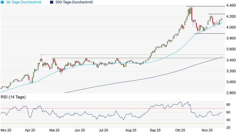 Zinssenkungsperspektiven jedoch wieder etwas eintrüben, dürfte ein Heranlaufen an das Rekordhoch zumindest kurzfristig schwierig werden. In diesem Fall könnte sogar die 38-Tage-Linie noch einmal in den Fokus rücken. Gravierend eintrüben würde sich das kurzfristige Chartbild jedoch erst bei einem Unterschreiten des jüngsten Korrekturtiefs vom 28. Oktober bei 3.887 Dollar.