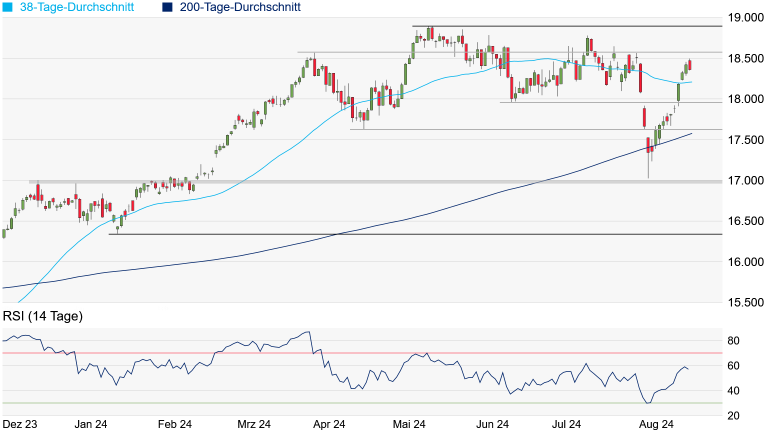 immer mehr zum Sorgenkind. Einen Zinsdämpfer auf dem bevorstehenden Notenbanker-Treffen könnte den DAX daher schwerer kompensieren. Somit sollte auch die Unterseite im Auge behalten werden. Wird die aktuell bei 18.209 Punkten verlaufende 38-Tage-Linie erneut unterschritten, könnte das Juni-Tief bei 17.951 Punkten schnell wieder in den Fokus rücken.