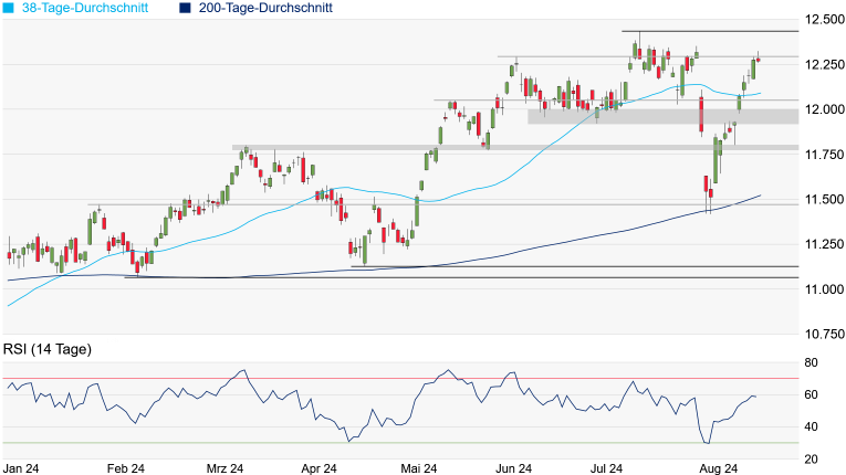 liess das Kaufinteresse oberhalb des Juni-Hochs bei 12.295 Punkten spürbar nach. Kann der SMI die Hürde jedoch meistern, würde das Jahreshoch vom Juli bei 12.434 Punkten in den Fokus rücken. Auf der Unterseite taucht die erste signifikante Unterstützung hingegen erst am aktuell bei 12.092 Punkten verlaufenden 38-Tage-Durchschnitt auf. Eine weitere Unterstützung würde dann am Mai-Hoch bei 12.050 Punkten warten, ehe die psychologisch wichtige 12.000er-Marke wieder in den Fokus rücken