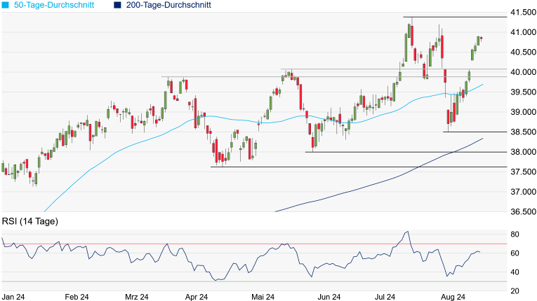 nach oben wäre dann erst einmal reichlich vorhanden. Mögliche Impulse könnten allerdings auch in die andere Richtung wirken. Legt der Dow wieder den Rückwärtsgang ein, würde die erste signifikante Unterstützung erst am Mai-Hoch bei 40.077 Punkten auftauchen. Danach würde sich noch das März-Hoch bei 39.887 Punkten in den Weg stellen, ehe die aktuell bei 39.697 Punkten verlaufende 50-Tage-Linie in den Fokus rücken könnte.