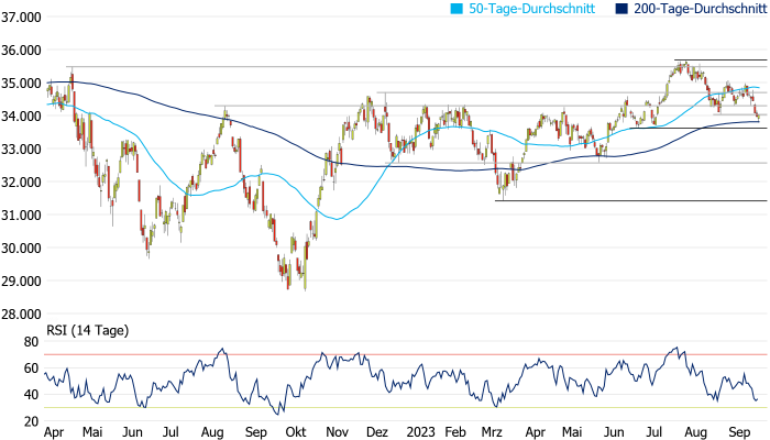 Abwärtsbewegung bereits wieder beendet sein. Das Chartbild würde sich jedoch erst wieder leicht aufhellen, wenn die aktuell bei 34.840 Punkten verlaufende 50-Tage-Linie zurückerobert wird. Vorher stellen sich jedoch noch weitere Hindernisse in den Weg. Wird hingegen auch die 200-Tage-Linie nachhaltig unterschritten, würde sich bis zum Mai-Tief bei 32.587 Punkten nur noch das Zwischentief vom 26. Juni bei 33.610 Punkten in den Weg stellen.