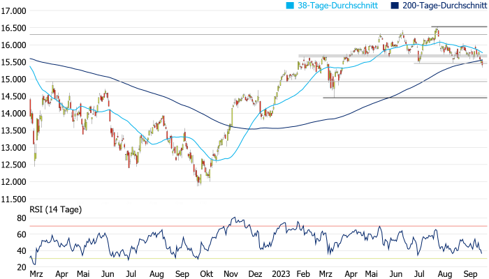 das Chartbild gravierend eintrübte. Im Tief ging es gestern bereits bis auf 15.329 Punkte abwärts. Die nächste Unterstützung taucht nun aber erst am Zwischenhoch vom März 2022 bei 14.925 Punkten auf. Wehren sich die Bullen und kann der DAX die 200-Tage-Linie zurückerobern, könnte die Widerstandszone zwischen 15.629 und 15.706 Punkten kurzfristig wieder angesteuert werden.