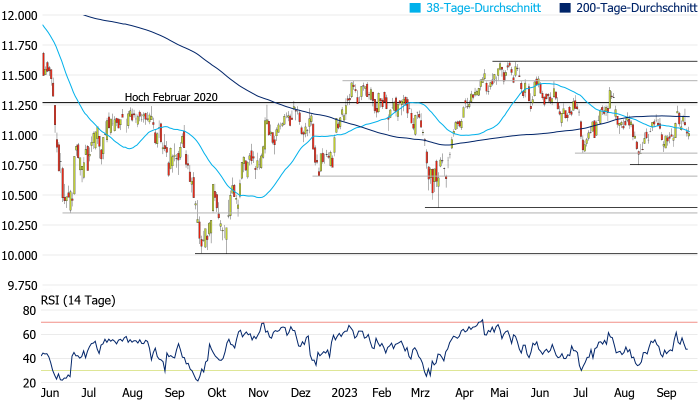 Chart-Situation nahezu unverändert blieb. Auf der Oberseite könnte die aktuell bei 11.153 Punkten verlaufende 200-Tage-Linie ein mögliches Anlaufziel der Bullen sein. Auf der Unterseite dürften die Bären hingegen versuchen, den SMI unter das Juli-Tief bei 10.852 Punkten und unter das August-Tief bei 10.749 Punkten zu drücken.