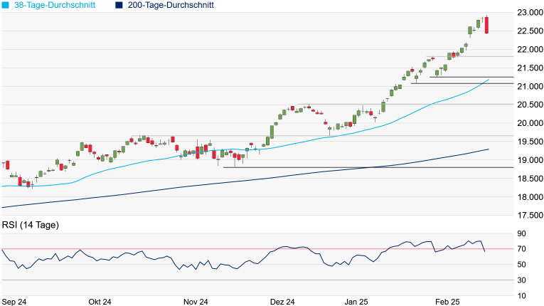 entsprechend heftig ausfielen, war angesichts der jüngsten Rally auch keine Überraschung. Ob es sich jedoch lediglich um ein Luftholen oder den Beginn einer kräftigeren Korrektur handelt, kann aktuell noch nicht gesagt werden. Auf der Unterseite hat der DAX wegen der steilen Aufwärtsbewegung kaum nennenswerte Unterstützungen gebildet. Die erste taucht erst am Zwischenhoch vom 31. Januar bei 21.801 Punkten auf.