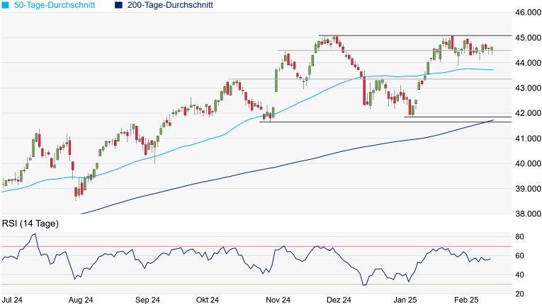 Zwischenhochs vom 11. November bei 44.487 Punkten behaupten, womit der Weg in Richtung Rekordhoch im Grunde unverbaut ist. Ein neues Hoch könnte neues Kaufinteresse erzeugen und für einen kräftigen Schub sorgen. Hält die seit Ende Januar anhaltende Konsolidierung hingegen an und unterschreitet der Dow die November-Marke nachhaltig, könnte der aktuell bei 43.721 Punkten verlaufenden 50-Tage-Durchschnitt noch einmal in den Fokus rücken.