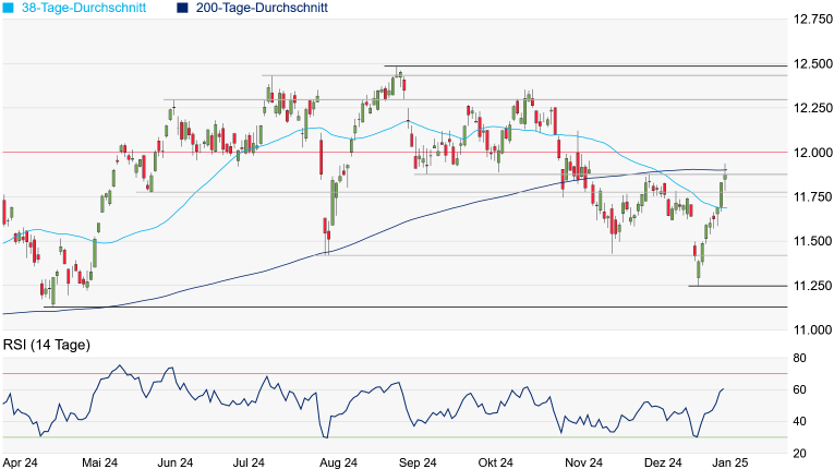 Chartbild würde sich hingegen wieder etwas gravierender eintrüben, wenn die aktuell bei 11.686 Punkten verlaufende 38-Tage-Linie unterschritten wird.