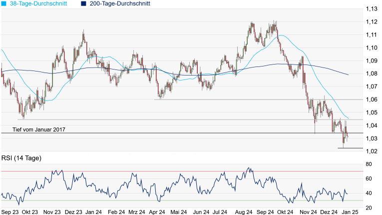 gestrige Tagestief lag bei 1,0274 Dollar. Sowohl aus fundamentaler als auch aus charttechnischer Sicht spricht derzeit wenig für ein Comeback des Euro. Für die Devisenexperten der Commerzbank ist eine EUR-USD-Parität in den kommenden Monaten nach wie vor das wahrscheinlichste Szenario. Aus charttechnischer Sicht wäre sogar ein Rücksetzer auf das Tief vom September 2022 bei 0,9536 Dollar denkbar. Aufhellen würde sich das kurzfriste Chartbild erst bei einem Überqueren des Tiefs vom Oktober