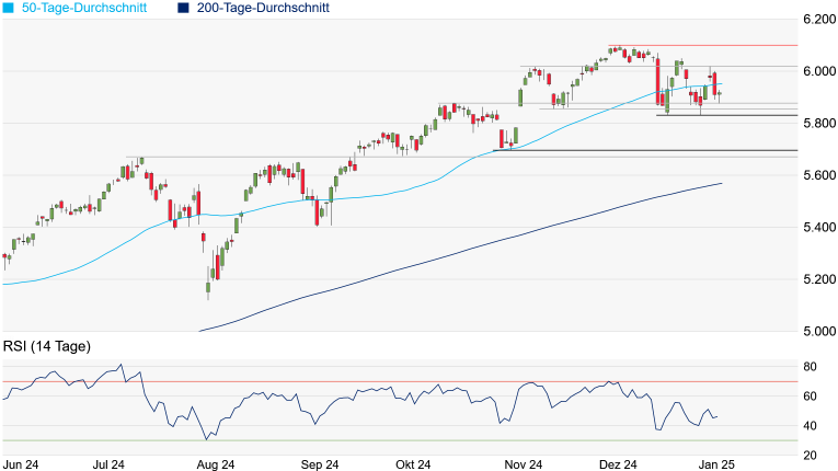 5.878 Punkten gestern als standfest - im Tagestief ging es bis auf 5.874 Punkte abwärts, ehe wieder leichtes Kaufinteresse einsetzte. Entscheidend aufhellen würde sich das Chartbild erst oberhalb des Zwischenhochs vom 11. November bei 6.017 Punkten. Danach wäre der Weg in Richtung Rekordhoch bei 6.100 Punkten unverbaut. Auf der Unterseite stehen die Tiefpunkte vom 20. Dezember bei 5.832 Punkten und vom 2. Januar bei 5.830 Punkten im Fokus. Bei einem Unterschreiten würde sich weiteres