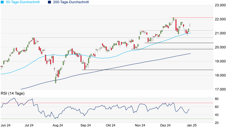 es zwischenzeitlich sogar noch etwas kräftiger aufwärts, doch kam es in der zweiten Handelshälfte zu leichten Gewinnmitnahmen. Auf der Oberseite stellt sich nun lediglich noch das Zwischenhoch vom 26. Dezember bei 21.838 Punkten in den Weg, ehe das Rekordhoch vom 16. Dezember bei 22.133 Punkten wieder in den Fokus rücken könnte. Auf der Unterseite hat sich der NASDAQ-100 zuletzt wieder etwas Luft verschafft. Wird das November-Hoch bei 21.182 Punkten wieder unterschritten, könnte ein