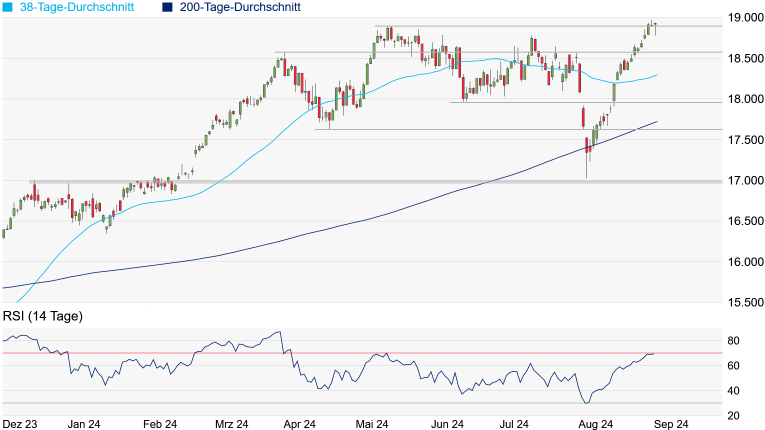 wichtigen Unterstützungen entfernt. Wird das Mai-Hoch bei 18.893 Punkten unterschritten, würde die nächste signifikante Unterstützung erst am April-Hoch bei 18.567 Punkten auftauchen, ehe die aktuell bei 18.296 Punkten verlaufende 38-Tage-Linie in den Fokus rücken könnte.