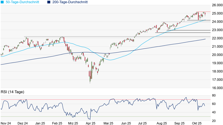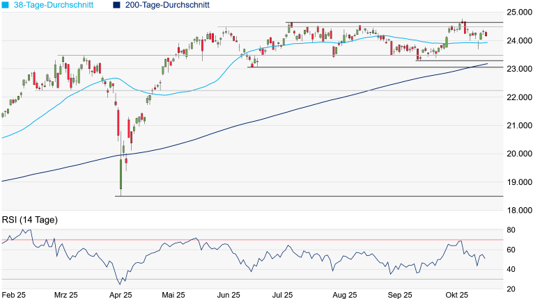 öffnen am Mittwoch und Donnerstag ihre Bücher. Können die Tech-Giganten mehrheitlich überzeugen, dürfte die Rally ihre Fortsetzung finden. Bei Enttäuschungen dürfte es jedoch zu kräftigen Gewinnmitnahmen kommen. Im Fokus dürfte auf der Unterseite der Unterstützungsbereich bei 24.217/23.969 Punkten stehen, der aus dem 50-Tage-Durchschnitt, dem Zwischentief vom 25. September und dem August-Hoch resultiert. Erst darunter könnte es wieder etwas ungemütlicher werden.
