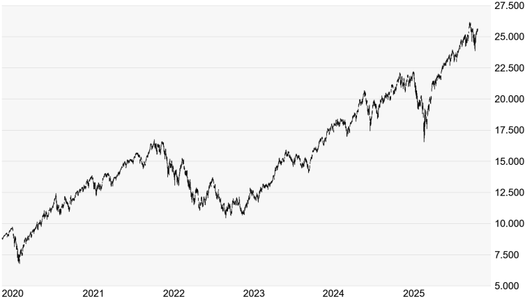 Quelle: Bloomberg. Bitte beachten Sie, dass aus der Wertentwicklung in der Vergangenheit nicht auf die zukünftige Wertentwicklung geschlossen werden kann. | | Charttechnik: Der NASDAQ-100 hat sich zuletzt wieder Stück für Stück nach oben bewegt und gestern bei 25.658 Punkten ein 3-Wochen-Hoch erreicht. Dieses Niveau konnte der Technologie-Leitindex zwar nicht ganz verteidigen, doch ist das kurzfristige Chartbild weiterhin vielversprechend. Bis zum Rekordhoch vom 29. Oktober bei 26.182 Punkten stellt sich im Grunde kein signifikantes Hindernis mehr in den Weg. Sollte die Stimmung wieder kippen, droht auf der Unterseite zunächst jedoch wenig Gefahr. Selbst wenn