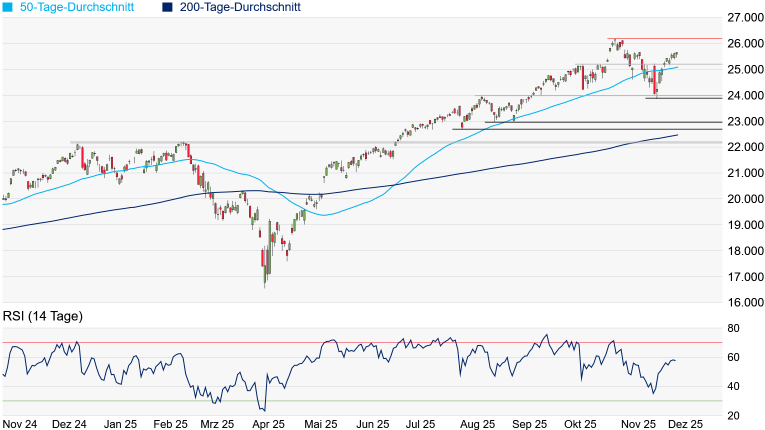 die aktuell bei 25.088 Punkten verlaufende 50-Tage-Linie wieder unterschritten wird, würden mit dem August-Hoch bei 23.969 Punkten und dem November-Tief bei 23.854 Punkten noch zwei massive Unterstützungen warten. Geht es jedoch darunter, würde die nächste Unterstützung erst am Unterstützungsbereich bei 22.978/22.960 Punkten auftauchen.