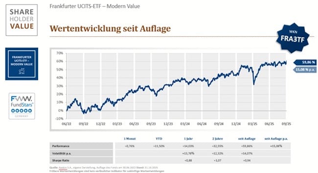Der Frankfurter UCITS-ETF - Modern Value (WKN: FRA3TF) feierte im Juli 2025 sein dreijähriges Jubiläum. Als erster aktiver ETF einer deutschen Boutique wurde er in Zusammenarbeit mit Axxion und Solactive aufgelegt und bildet seit 1. Juli 2022 den Frankfurter Modern Value Index ab. Der ETF bietet die Vorteile eines kostengünstigen, liquiden Produkts - mit der Klarheit und Qualität eines aktiven Ansatzes.
